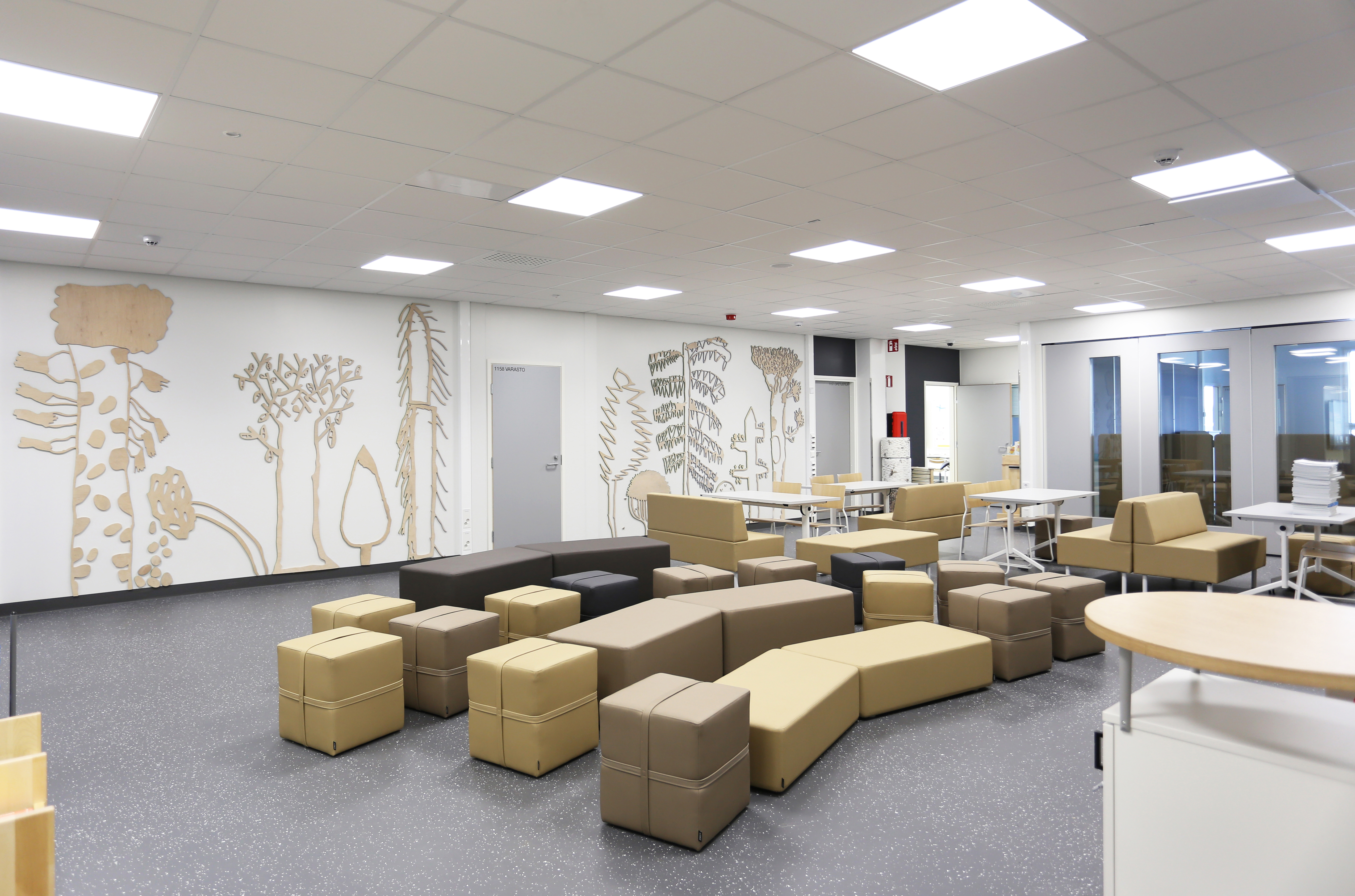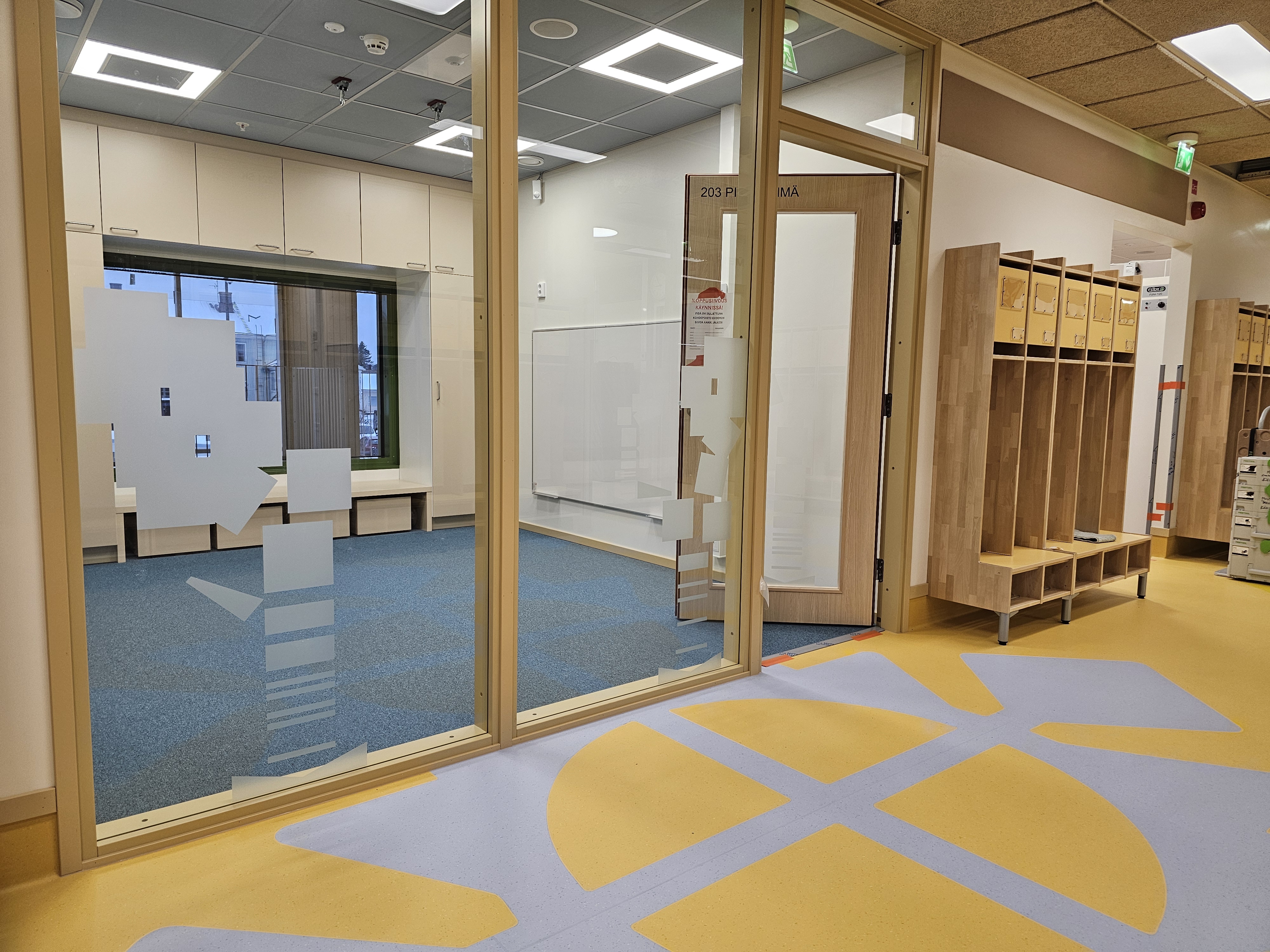 Lattiapinnat, akustiikkaseinät ja huomioteippaukset | Floor surfaces in corridors, acoustic walls, and warning tapes on glass surfaces, 2025