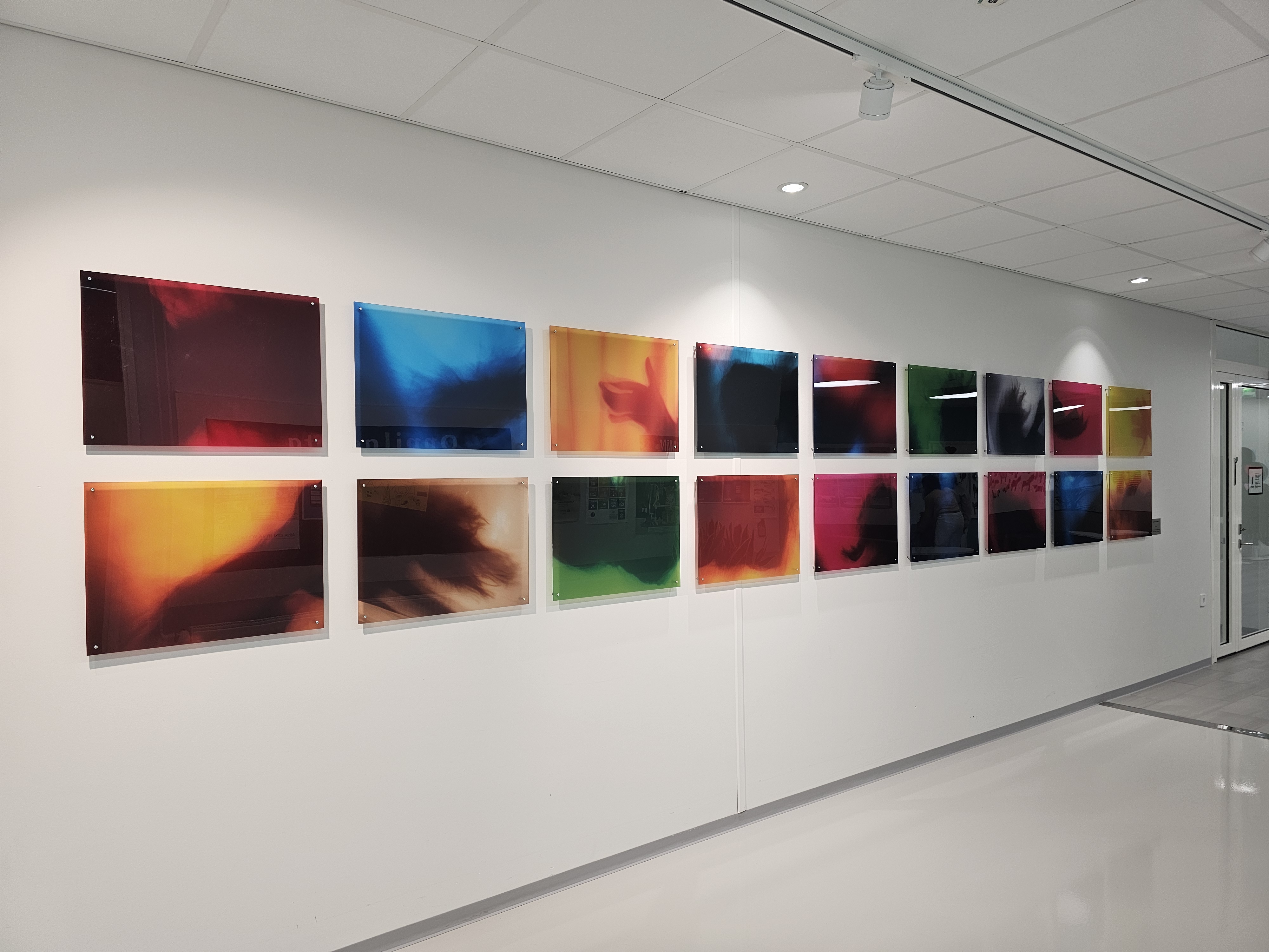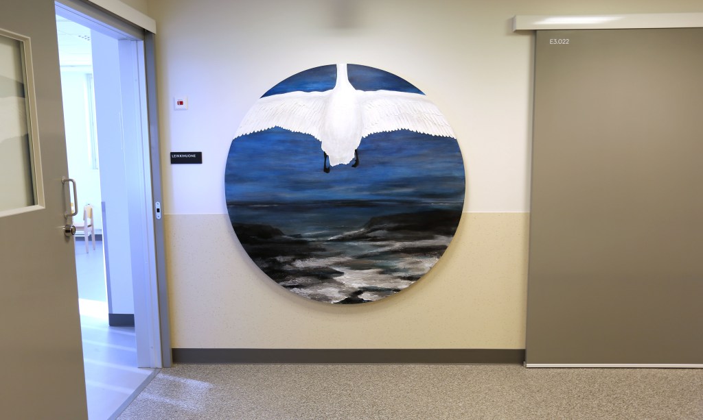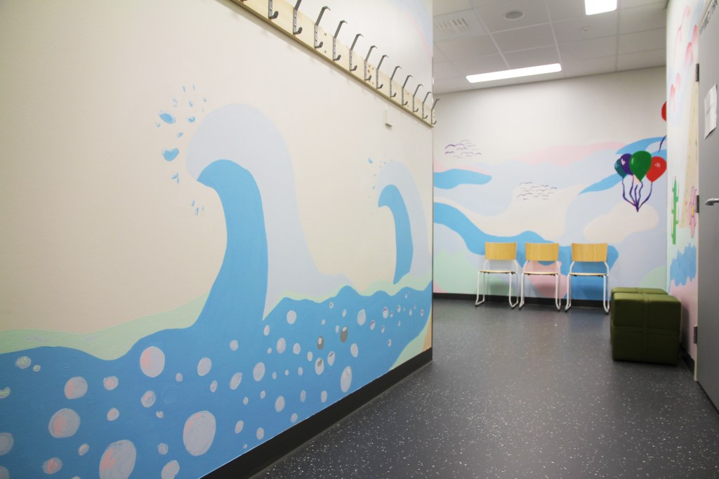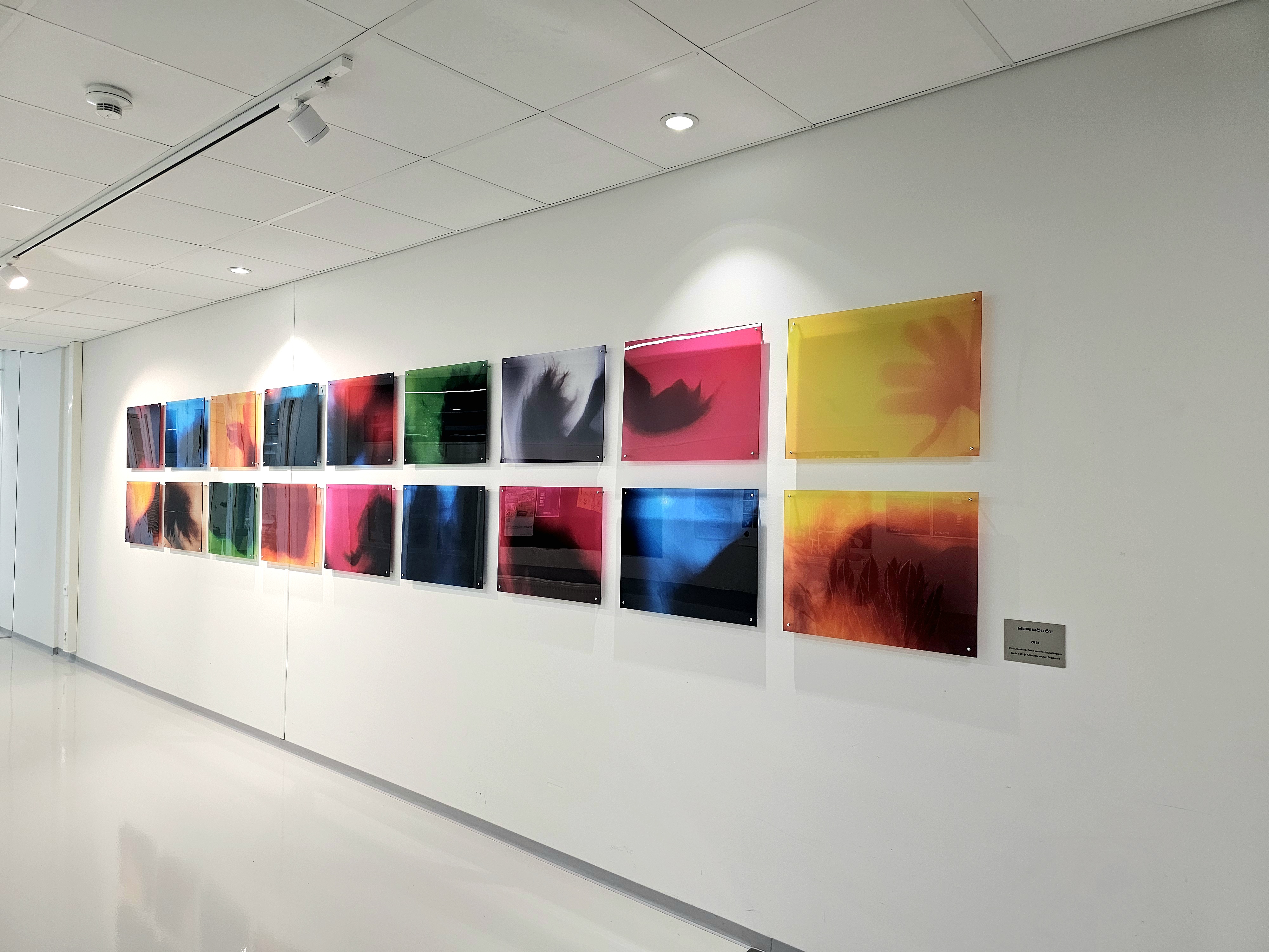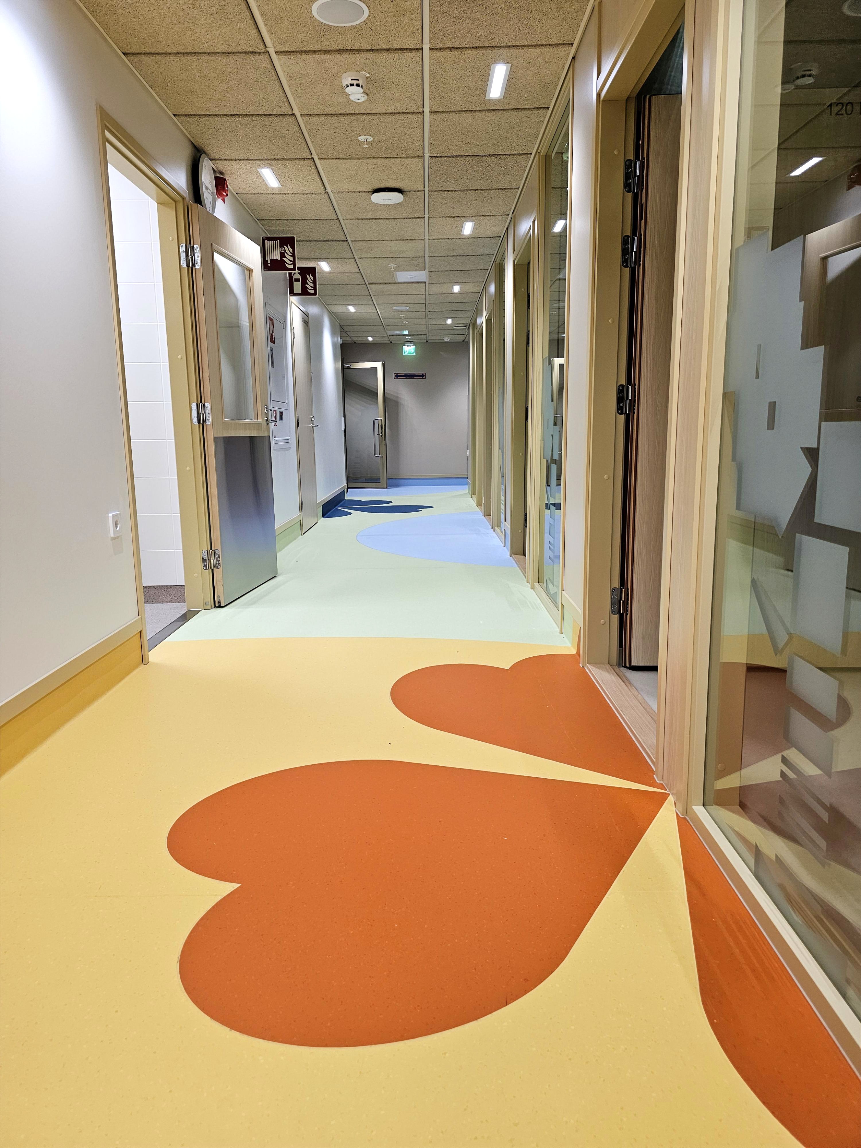 Päiväkoti Koivistoisen julkinen taide on erityistä siksi, että lastenkulttuurikeskus Kruunupään kuvataiteilijoilla oli mahdollisuus olla mukana prosessin alkuvaiheessa yhteistyössä rakennuttajan ja arkkitehdin kanssa. Yhdessä valokuvataiteilija Päivi Setälän kanssa suunnittelimme lasten ja aikuisten tilojen käytävien lattiakuviot, ruokalan ja neuvottelutilan akustiikkaseinät ja koko rakennuksen lasipintojen huomioteippaukset. | The public art at the Koivistoinen daycare center is special because the visual artists at the Kruunupää Children’s Cultural Center had the opportunity to be involved in the early stages of the process in collaboration with the builder and architect. Together with photographer Päivi Setälä, we designed the floor patterns for the corridors in the children’s and adults’ areas, the acoustic walls in the dining area and meeting room, and the decorative warning tapes on the glass surfaces throughout the building.