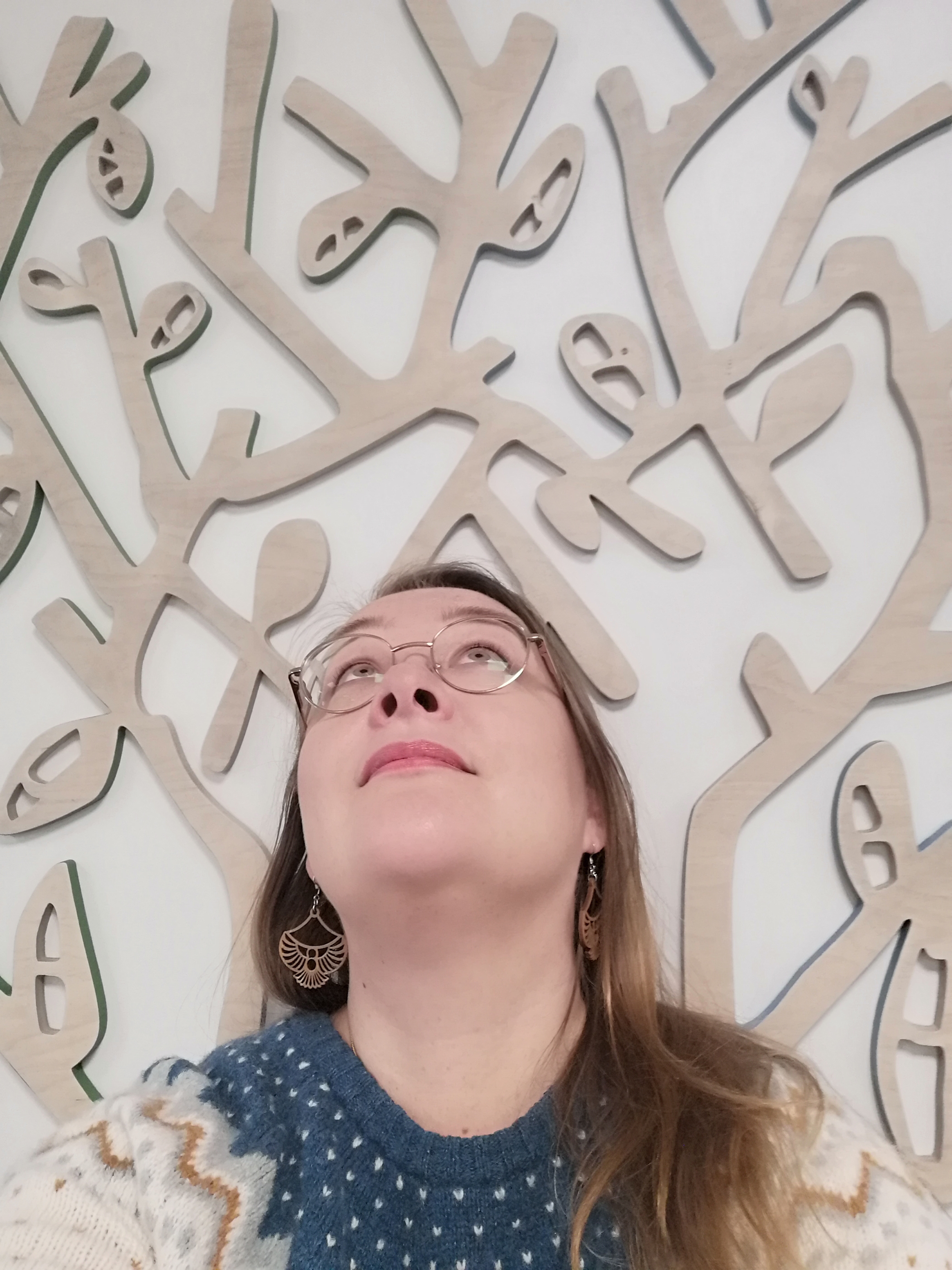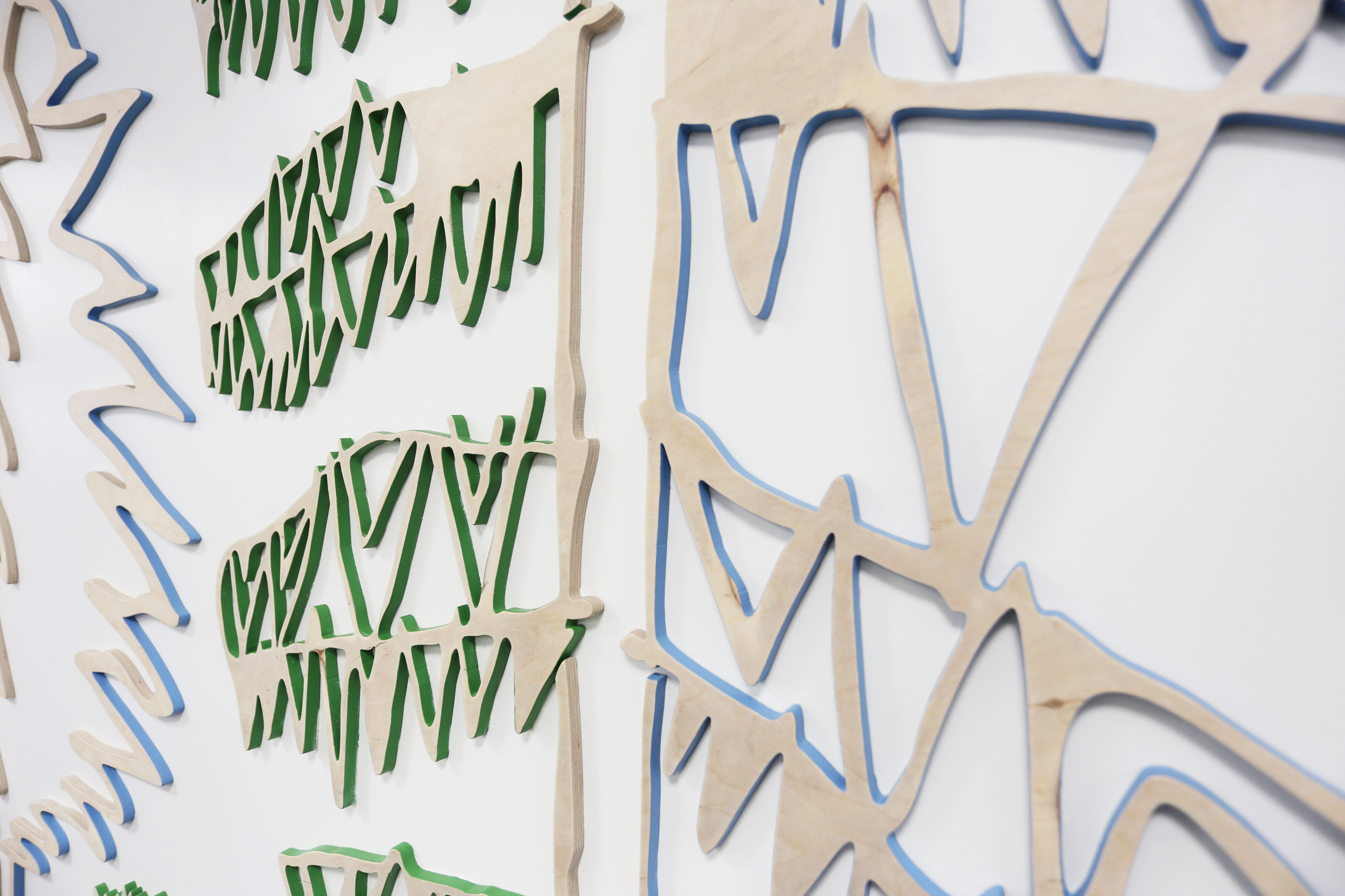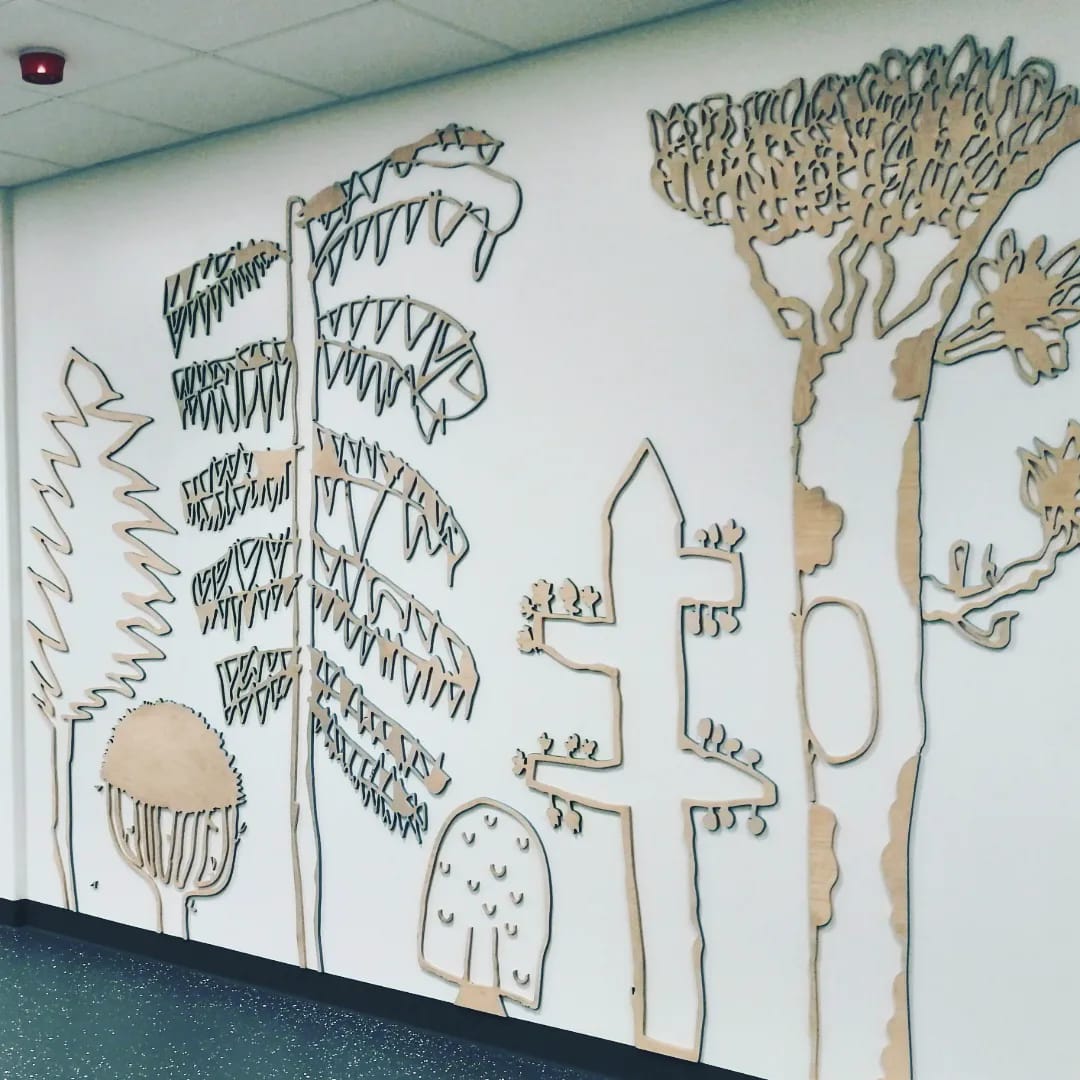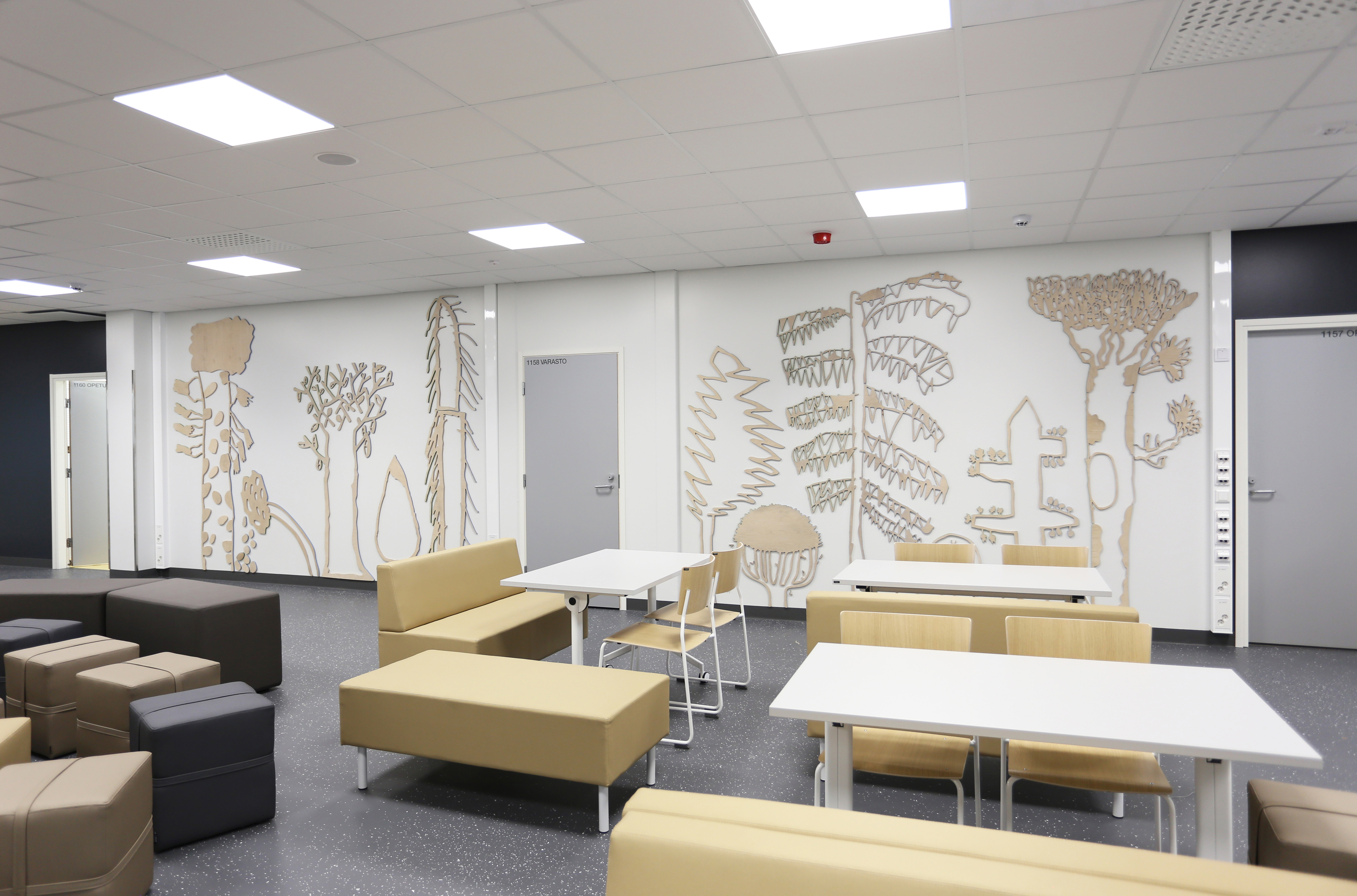 Metsä on suuri, koko seinään vaneripiirroksina muotoutuva teos, jonka olen tehnyt yhdessä koulun 1.–2.-luokkalaisten kanssa. Teoksen pohjana ovat lasten tekemät piirrokset puista eri tuuliolosuhteissa. Parivuotinen julkisen taiteen projekti alkoi oppilaiden kanssa purevassa pakkasessa Vähärauman koulun tyhjältä tontilta kuuntelukävelyillä. | The Forest is a large work of art, consisting of plywood drawings covering an entire wall, which I created together with 1st and 2nd graders at the school. The work is based on drawings of trees in different wind conditions made by the children. The two-year public art project began with the pupils on a bitterly cold day on the empty grounds of the Vähärauma school, sensing the empty area by sound walking.
