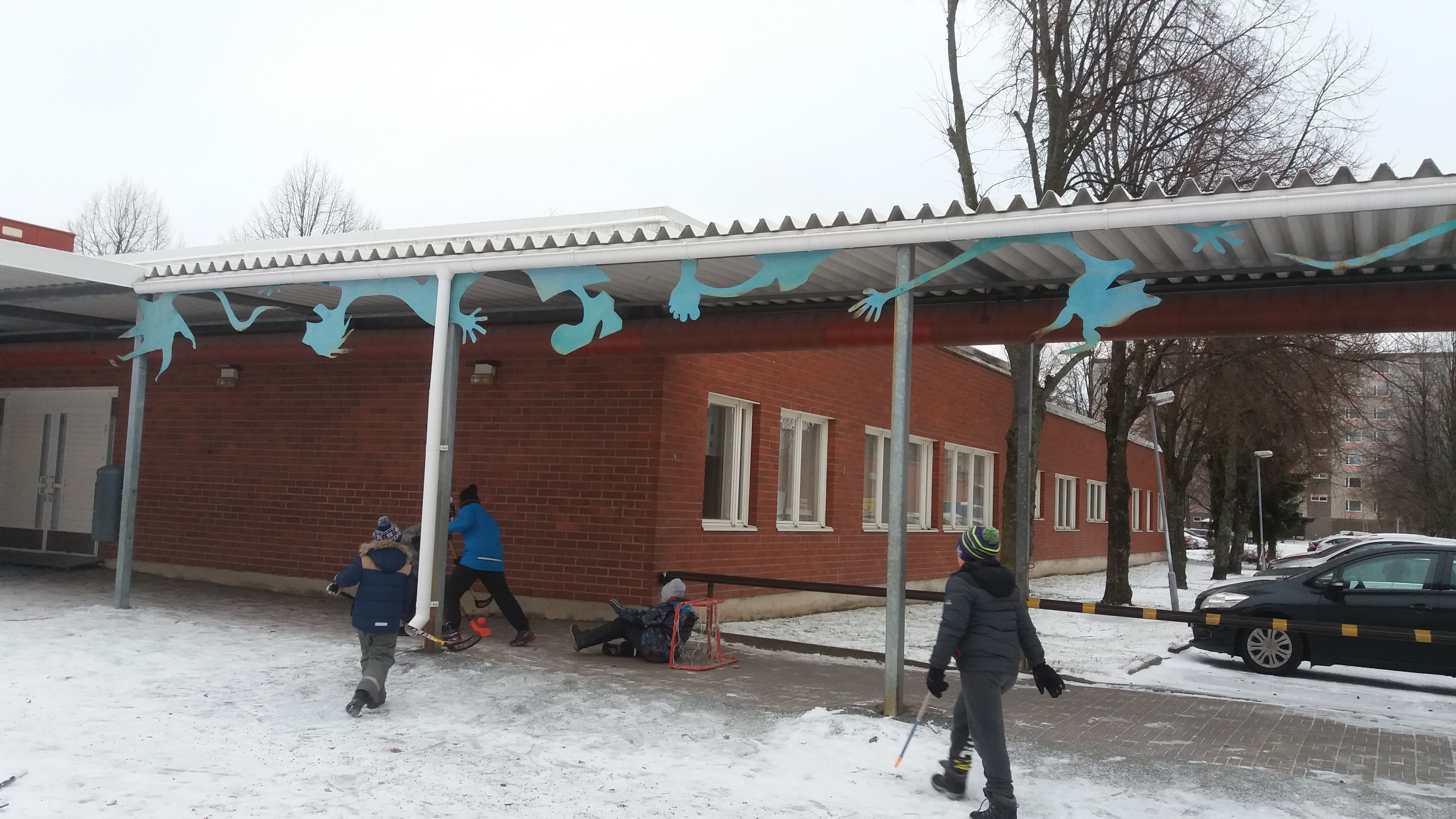Välitunti oli oppilaiden piirosten pohjalta kokoamani noin 12 metrinen maalattu metalliveistos. Veistos tuhoutui ilmoittamatta koulun purkamisen yhteydessä. | The Recess was a 12-meter painted metal sculpture that I assembled based on the students’ drawings. The sculpture was destroyed without notice when the school was demolished.